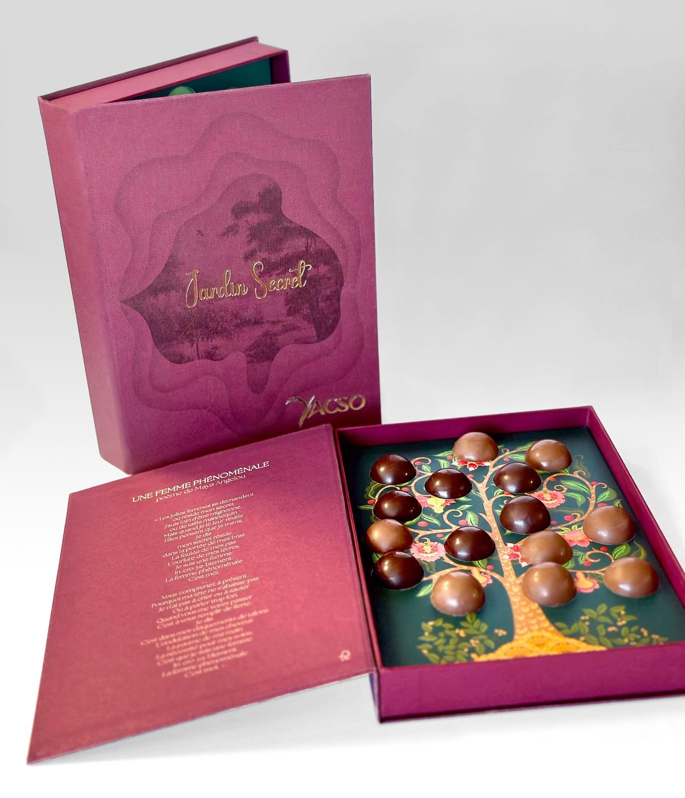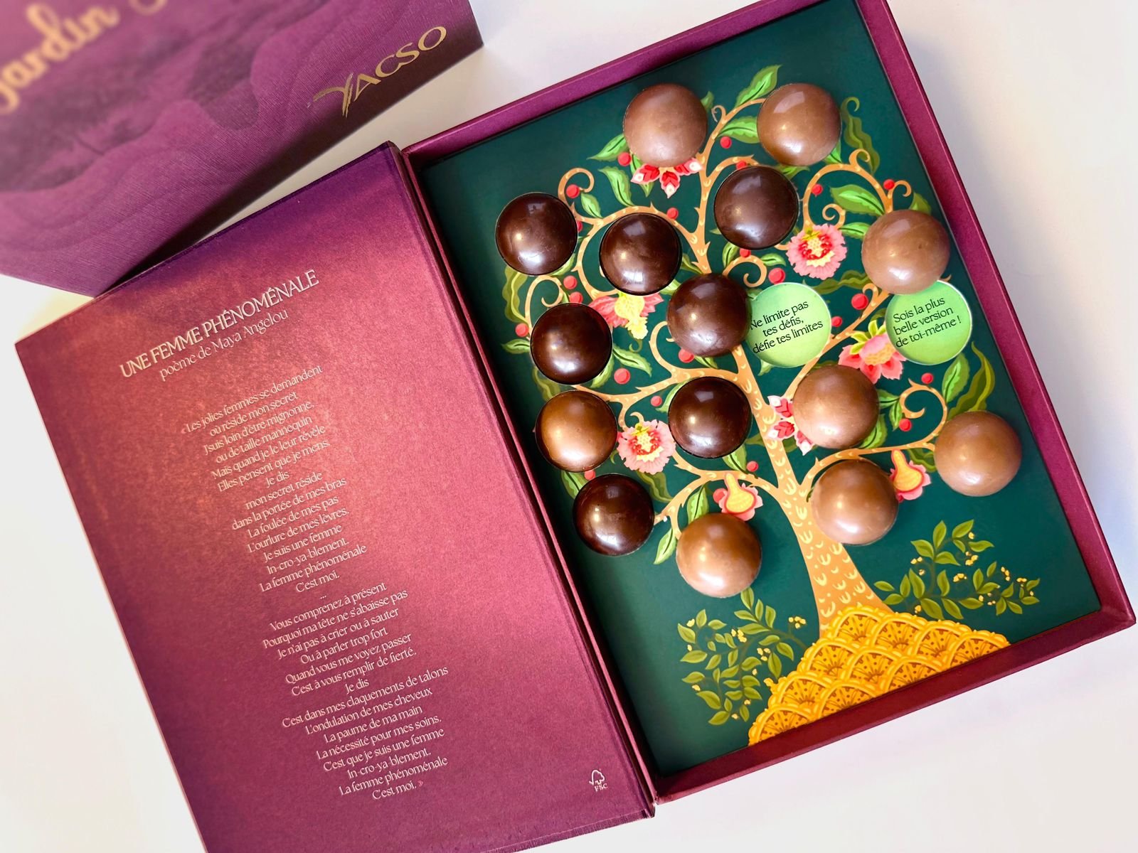 Le coffret Une Femme Phénoménale est né de cette intention : célébrer la femme dans toute sa richesse, sa complexité et sa force intérieure. Inspiré par le poème emblématique Une femme phénoménale de Maya Angelou, il se présente comme un écrin à la fois poétique et symbolique, où chaque chocolat devient un mot, une émotion, une reconnaissance.